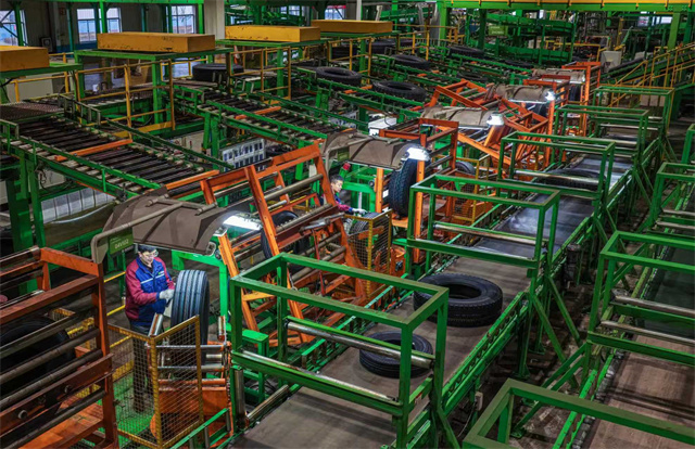 在浦林成山(山东)轮胎有限公司智能化生产车间,工人加紧赶制出口轮胎订单。