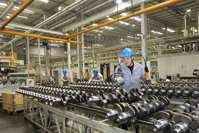 在天润工业曲轴智能制造事业部生产车间内,工人正检验产品。