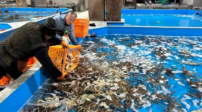 “75吨帝王蟹,听着数量庞大,船还没靠岸,订单已经排得满满——30%直供高端餐饮,40%入驻全国连锁商超,还有30%则通过电商直接进入消费者的‘购物车’。”润泽国际商务经理胡世杰介绍,根据目前的预订情况,今年春节,仅线上订单就约有5万单,销售额近500万元,与去年同期相比,帝王蟹、美贝、虾夷贝、波龙的销量增长了30%至50%不等。