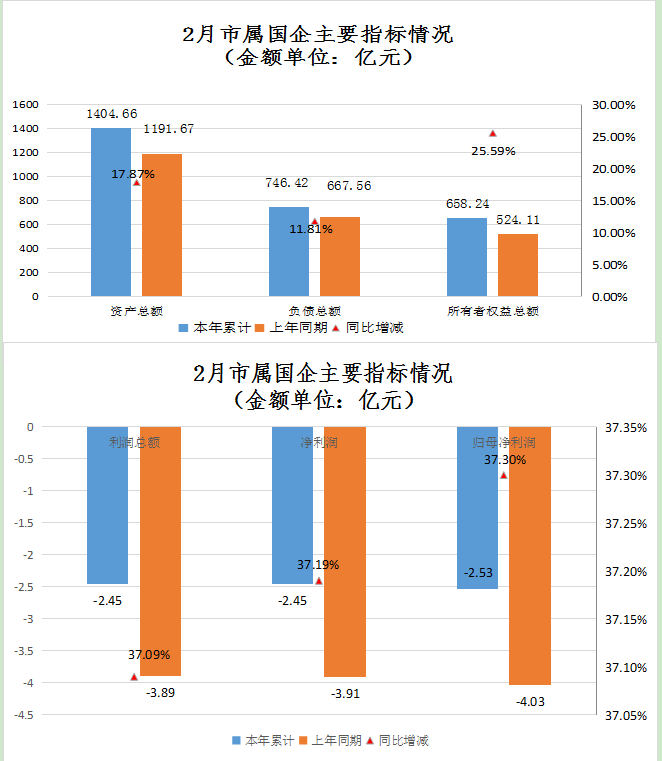 2026年2月末,14户市属国企资产总额1404.66亿元,同比增加212.99亿元,增长17.9%;负债总额746.42亿元,同比增加78.86亿元,增长11.8%;净资产658.24亿元,同比增加134.12亿元,增长25.6%,其中:归属于母公司的净资产596.51亿元,同比增加82.93亿元,增长16.1%;资产负债率53.14%,同比下降2.88个百分点。
