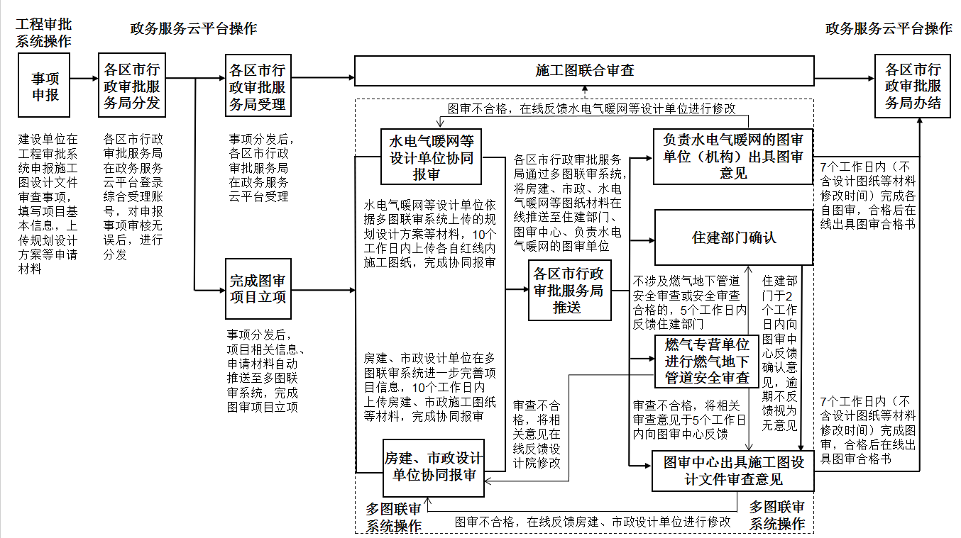 (二)规范办理流程。建设单位在工程审批系统申报建筑工程施工图设计文件审查事项后,相关项目信息、规划设计方案等材料自动推送至多图联审系统,由相关设计单位10个工作日内上传各自设计图纸,完成协同报审。报审完成后,由各区市行政审批服务局在线推送至住建部门及相关图审单位(机构)进行审查。各图审单位(机构)收到上传的设计图纸等材料后,需在7个工作日内(不含设计图纸等材料修改补充时间)出具施工图设计文件审查合格书(水电气暖网图审合格书详见附件1,施工图设计文件审查合格书仍使用原格式)。其中,地下部分施工图由住建部门组织相关燃气专营单位进行燃气地下管道安全审查,相关审查意见于7个工作日内向图审中心反馈,逾期不反馈视为无意见。各区市行政审批服务局在收到图审合格书后按时予以办结(具体办理流程详见附件2)。