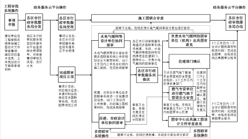 (一)明确工作职责。行政审批服务部门负责指导建设单位申报施工图审查事项,并做好事项分发、受理、办结等工作;房建、市政及水电气暖网等设计单位负责在规定时限内上传施工图纸,完成协同报审;住建部门负责组织相关燃气专营单位进行燃气地下管道安全审查,在规定时限内出具审查意见反馈图审中心;图审中心负责在规定时限内按照相关政策法规及技术规范要求进行施工图纸审查,同时接收燃气地下管道安全审查意见,待全部合格后出具图审合格书;水电气暖网等图审单位(机构)负责在规定时限内对用地红线内各自相关施工图纸进行审查,合格后出具图审合格书。
