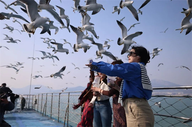 游客们搭乘今年首班航线,登船环岛,与黑尾鸥嬉戏,与大自然亲密接触,感受春天的气息。游船缓缓行驶在碧波之上,成群的海鸥追着游船盘旋。游客们纷纷伸出手,将食物抛向空中,引得黑尾鸥在天空中上下翻飞、追逐嬉戏、翩翩起舞,鸥鸣清脆悦耳。人与鸥鸟相映成趣,海风轻拂,一派自在悠然的画面。