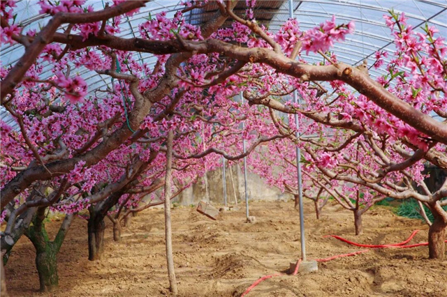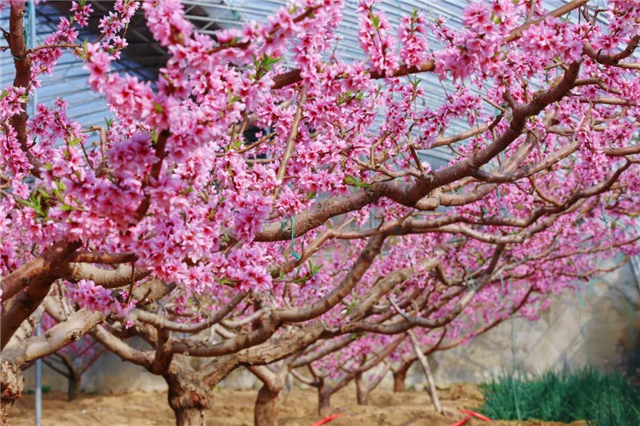 走进大棚,融融暖意夹杂着清甜的花香瞬间包裹周身。放眼望去,一排排桃树枝繁叶茂,一朵朵桃花挤挤挨挨地缀满枝头,娇嫩的花瓣层层叠叠,像是被春日晕染过的胭脂,浓淡相宜,优雅动人。
