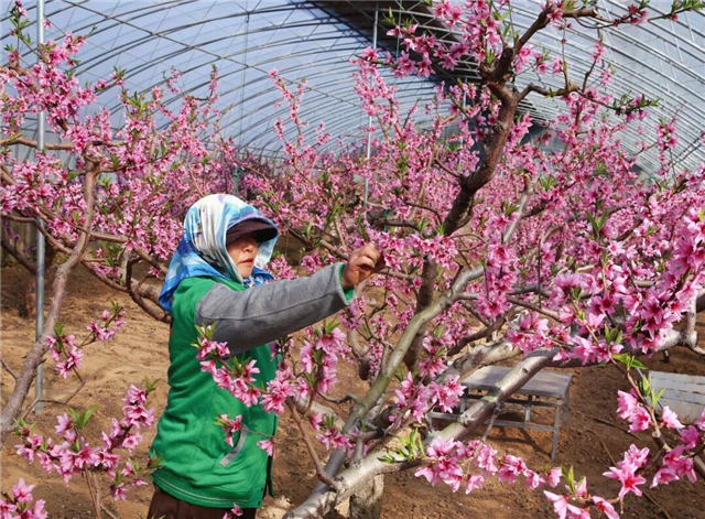 “大棚里的桃花,比露天的要早开将近一个多月呢。”种植大棚扁桃已有20余年的果农方女士一边打理花枝,一边笑着介绍。谈及桃花早开的秘诀,方女士表示:“关键还是靠温度把控,咱给大棚扣上棉被,既能提升棚内温度,晚上还能帮桃树抵御严寒,避免冻害。”