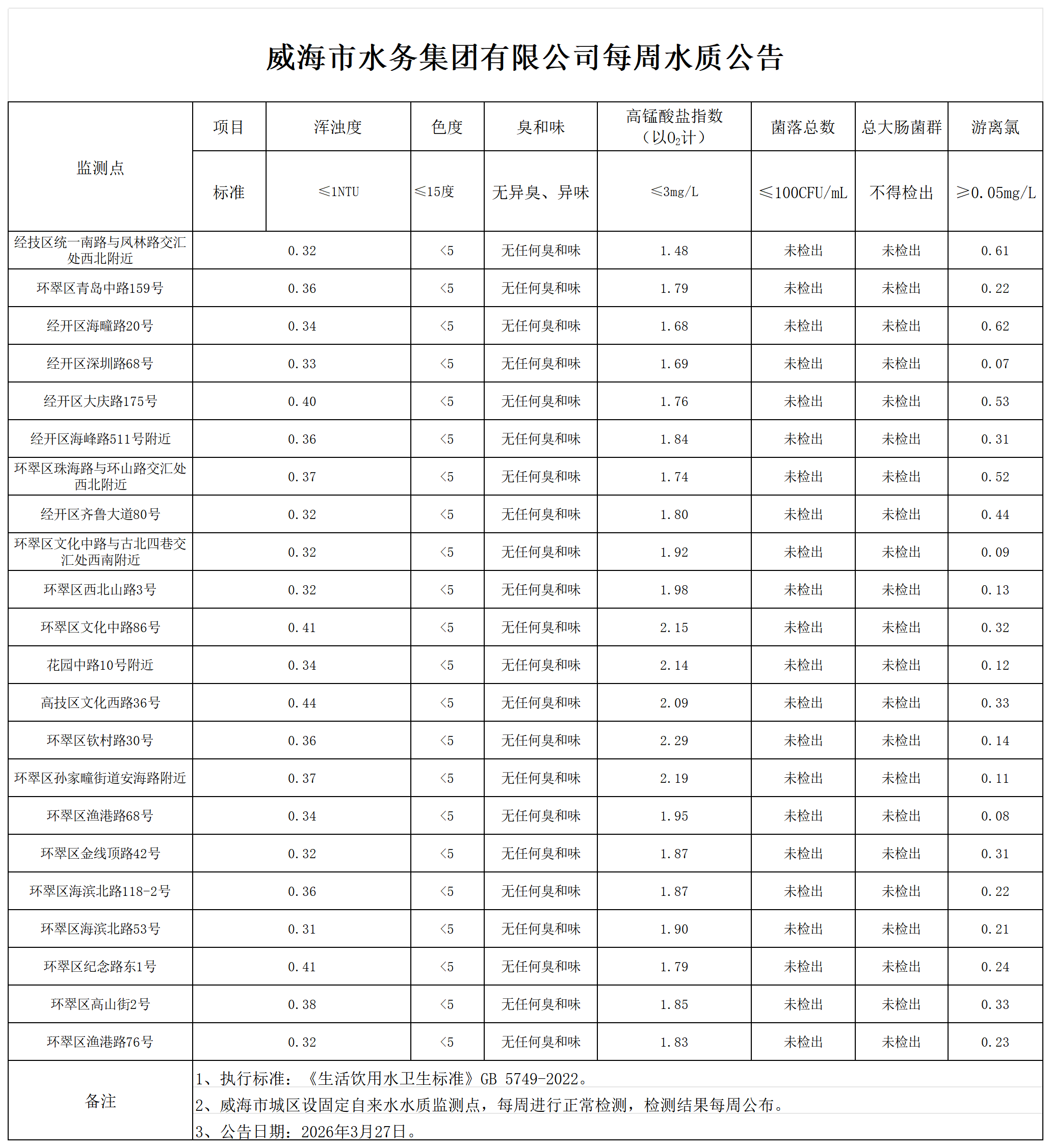 水务集团每周水质公告:2026.3.27
