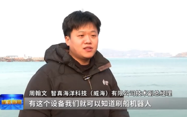 智真海洋科技(威海)有限公司技术副总经理周翰文说,有这个设备在,就可以知道刷船机器人在船底的一个精确位置,这样的话就能把船底清洗刷得更干净。这个方案也是现在目前来说比较独创的一个技术。