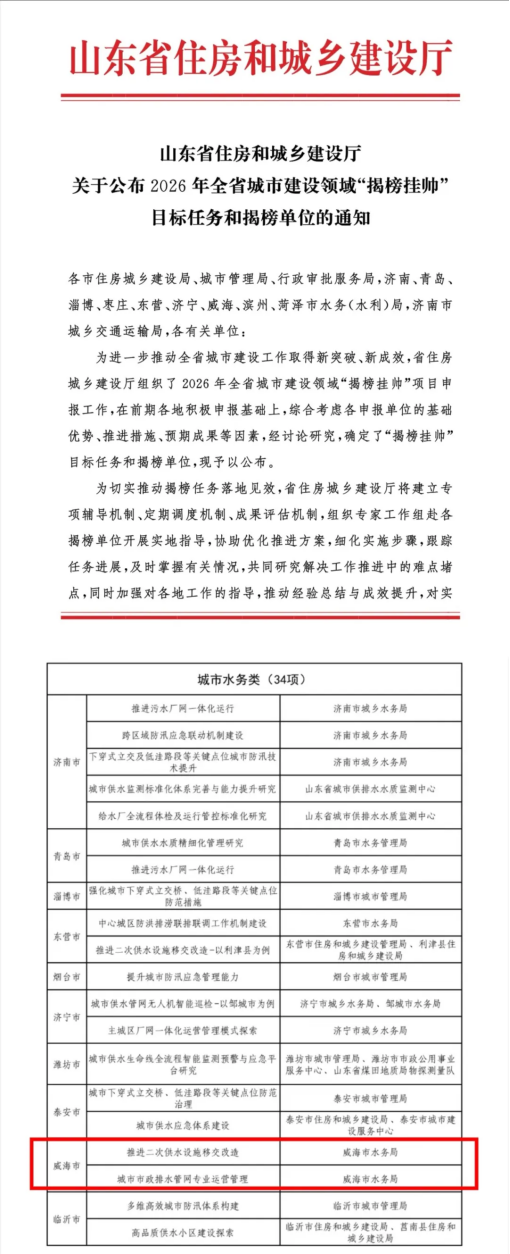 日前,省住房和城乡建设厅公布2026年全省城市建设领域“揭榜挂帅”目标任务和揭榜单位,市住房和城乡建设局《韧性城市视角下生命线安全工程系统风险智能预警与协同处置研究》《液化石油气企业标准化、规范化建设》,市水务局《推进二次供水设施移交改造》《城市市政排水管网专业运营管理》入围。