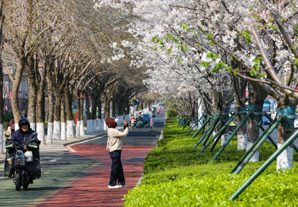 樱花绽放,不仅扮靓了城市道路,更把春日美景融入市民日常,出门即见花开,抬头便遇春色,让城市多了几分诗意与温柔。