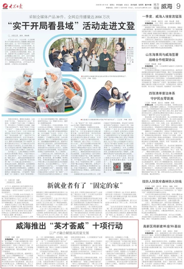 4月10日,《大众日报》刊发《威海推出“英才荟威”十项行动 以产才融合赋能高质量发展》,聚焦威海市2026年重磅推出的人才工作新举措,全面解读这座海滨城市如何以真挚诚意、优质政策、完善服务,广聚天下英才,为产业转型升级与高质量发展注入澎湃动能。以下为报道原文:
