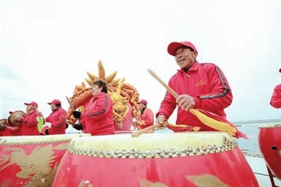 好当家集团谷雨祭海暨春参开捕仪式上,渔民敲响渔家大鼓。