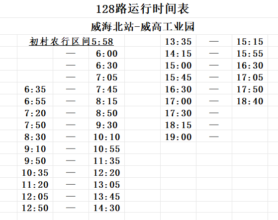 运行时间:威海北站07:20-16:50;长夼店子06:00-14:30。