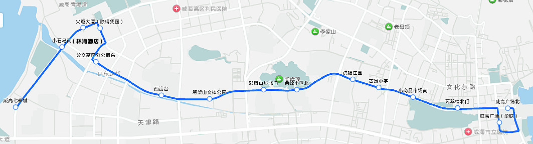 站点设置:威高广场北(至海港湾)-威高广场(华联)【七彩城发车不停靠】-环翠楼北门-小商品市场南-古寨小学-洪福庄园-柴峰小区北-彩凤山城北-笔架山文体公园-西涝台-公交高区分公司东-火炬大厦(联桥集团)-火炬八街-小石岛南(林海酒店)-观海澜湾【威高广场北发车不停靠】-威高七彩城。