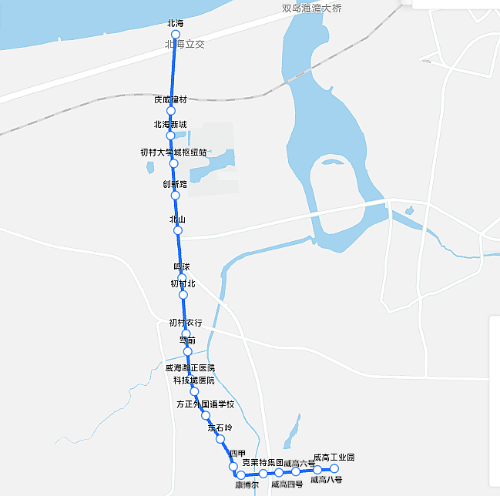 站点设置:威高工业园、威高八号、威高六号、威高四号、克莱特集团、康博尔、四甲、东石岭、方正外国语学校、科技城医院、威海瀚正医院、驾前、初村农行、初村北、鸣球、北山、创新路、初村大学城枢纽站【北海发车不停靠】、北海新城、庆威建材、北海。