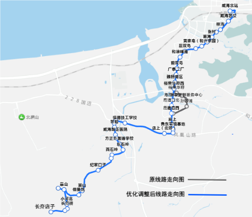 线路走向:由威海北站发车,途经环山路、沈阳中路、沈阳南路至裕荣华府西站,改行沈阳南路至廒上站,恢复原线路沿沈阳南路、凤凰山路、山海路、石岭路、华海路、X03、乡村道路至长夼店子站,取消裕荣华府、名流海岸山庄、羊亭党群服务中心、孙家滩、鹿道口5个站点;增设海然科技、鹿道口北、鹿道口西3个站点。