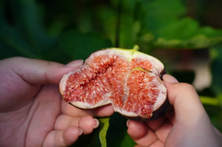 “成熟的果子,颜色要呈紫红色,手感微软,闻起来有清香味,果尾微微开裂,这样的甜度最高、口感最好。”石海霞一边说着,一边轻摘下一颗果实,熟练地掰开。只见鲜艳的红色果心软糯流蜜,晶莹的果蜜仿佛随时要滴落下来,让人垂涎欲滴。“别看我今年是头一回种无花果,我可是种了10多年草莓的‘老把式’了,管理起来得心应手。”