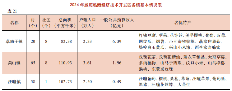 【概况】2024年底,威海临港经济技术开发区总面积296.04平方千米,辖3个镇、160个村(社区),户籍人口8.44万人。全年实现地区生产总值116.69亿元,比上年增长6.93%。其中,第一产业增加值4.44亿元,第二产业增加值68.66亿元,第三产业增加值43.59亿元。三次产业结构为3.8∶58.84∶37.36。固定资产投资104.1亿元,增长5.1%,其中第三产业投资增长4.6%。外商直接投资项目17个,增长6.3%。完成税收收入29.89亿元,增长6%。一般公共预算收入10.62亿元,增长9.1%;一般公共预算支出28.17亿元,增长118.4%。